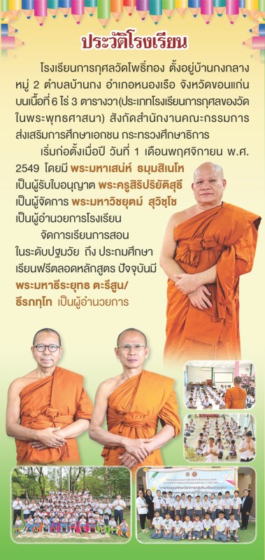 โรงเรียนการกุศลวัดโพธิ์ทอง ตั้งอยู่ หมู่ 2 ตำบลบ้านกง อำเภอหนองเรือ จังหวัดขอนแก่น สังกัดสำนักงานคณะกรรมการส่งเสริมการศึกษาเอกชน สำนักงานศึกษาธิการจังหวัดขอนแก่น กระทรวงศึกษาธิการ เป็นโรงเรียนการกุศลของวัดในพระพุทธศาสนา ประเภทสามัญศึกษา จัดการเรียนการสอนแบบ ไม่เสียค่าใช้จ่ายใดๆ ตลอดหลักสูตร เปิดรับสมัครนักเรียน อายุ 3 ปี ถึง 12 ปี เข้าเรียนในระดับ อนุบาล 3 ถึง ประถมศึกษาปีที่ 6 ตลอดเวลา