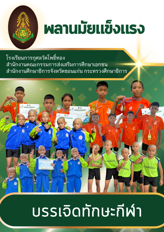 ประกาศเกียรติคุณ เหรียญเงิน กรีฑาวิ่งผลัด 4×100 เมตร 23 ตุลาคม 2567 การแข่งขันกีฬากลุ่มโรงเรียนการกุศลของวัดในพระพุทธศาสนา แห่งประเทศไทย ประจำปี 2567 โรงเรียนการกุศลวัดโพธิ์ทอง ได้รับเป็นตัวแทนภาคตะวันออกเฉียงเหนือ ประเภทกรีฑา รุ่่นอายุ 10 ปี เข้าร่วมแข ดูรายละเอียด >